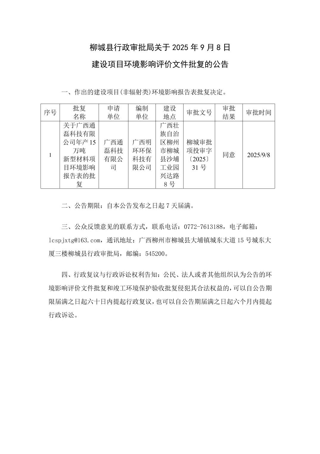 〔2025〕31號-關(guān)于廣西通磊科技有限公司年產(chǎn)15萬噸新型材料項目環(huán)境影響報告表的批復.docx