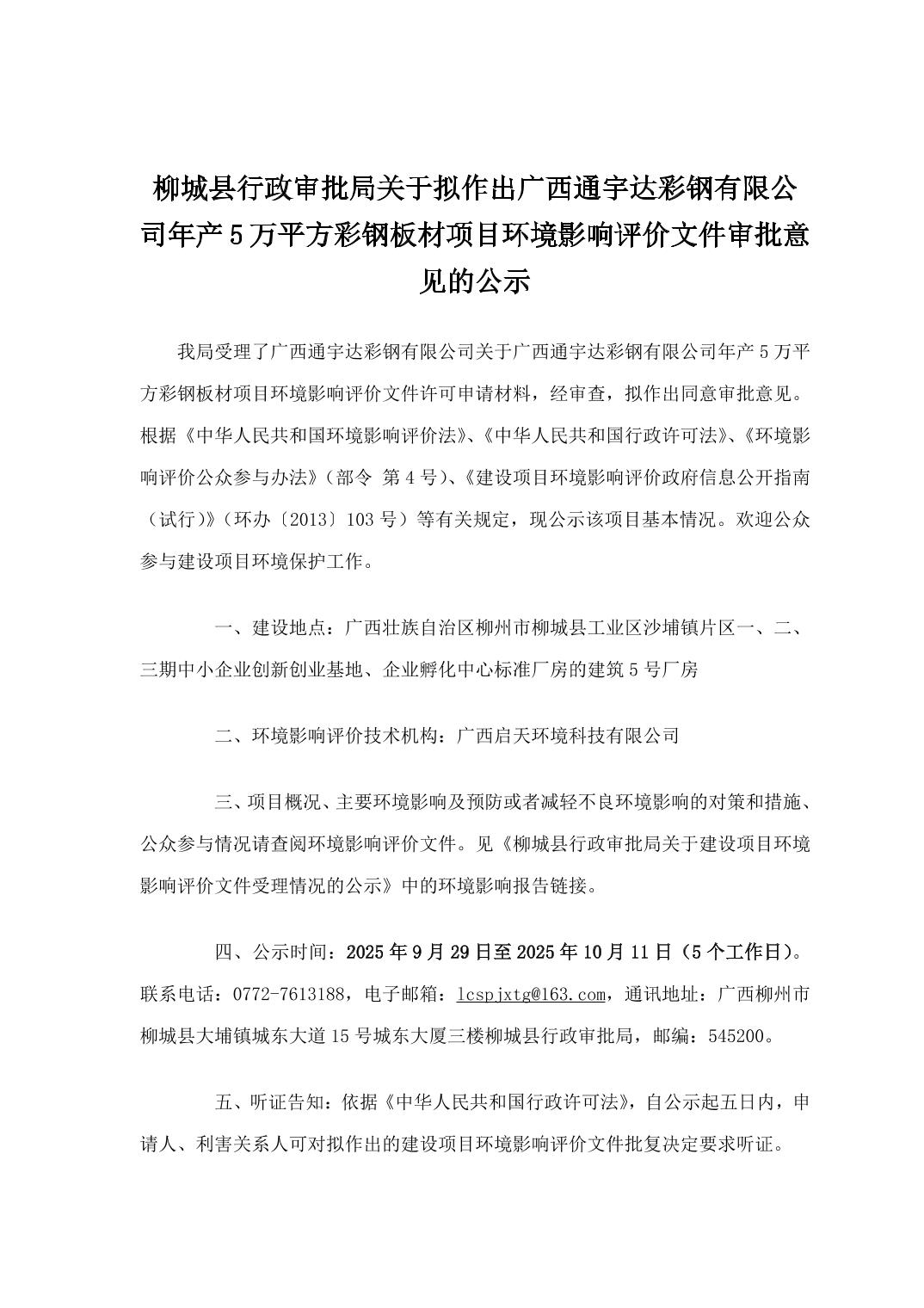 柳城縣行政審批局關(guān)于擬作出廣西通宇達(dá)彩鋼有限公司年產(chǎn)5萬(wàn)平方彩鋼板材項(xiàng)目環(huán)境影響評(píng)價(jià)文件審批意見(jiàn)的公示