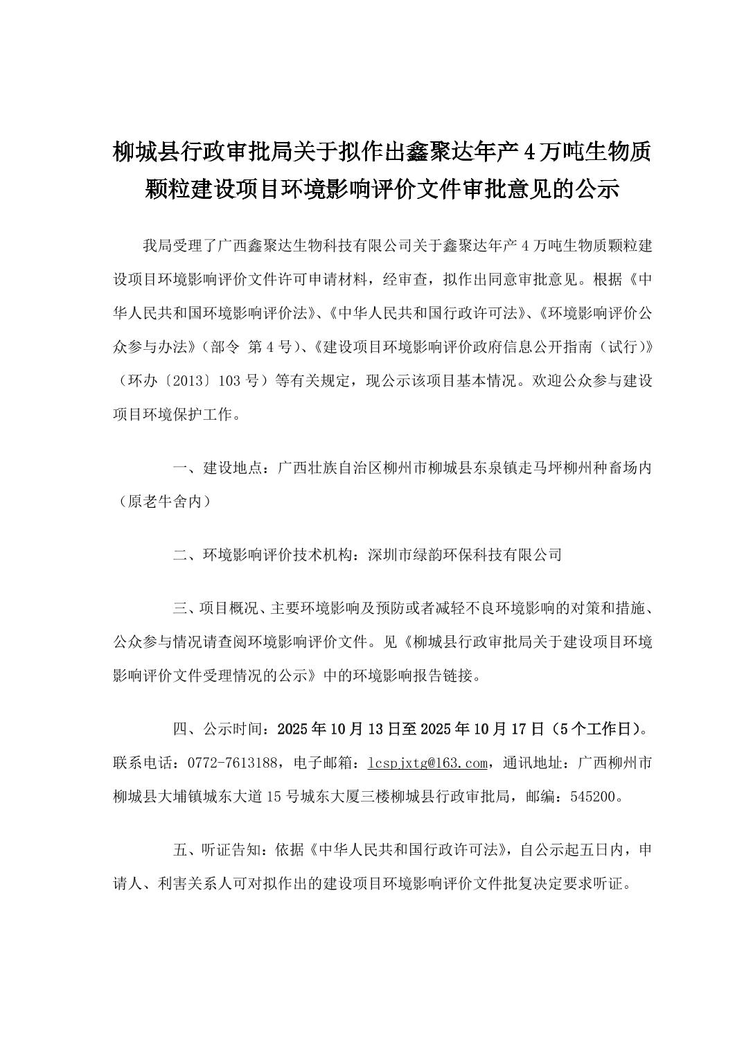 柳城縣行政審批局關(guān)于擬作出鑫聚達年產(chǎn)4萬噸生物質(zhì)顆粒建設(shè)項目環(huán)境影響評價文件審批意見的公示